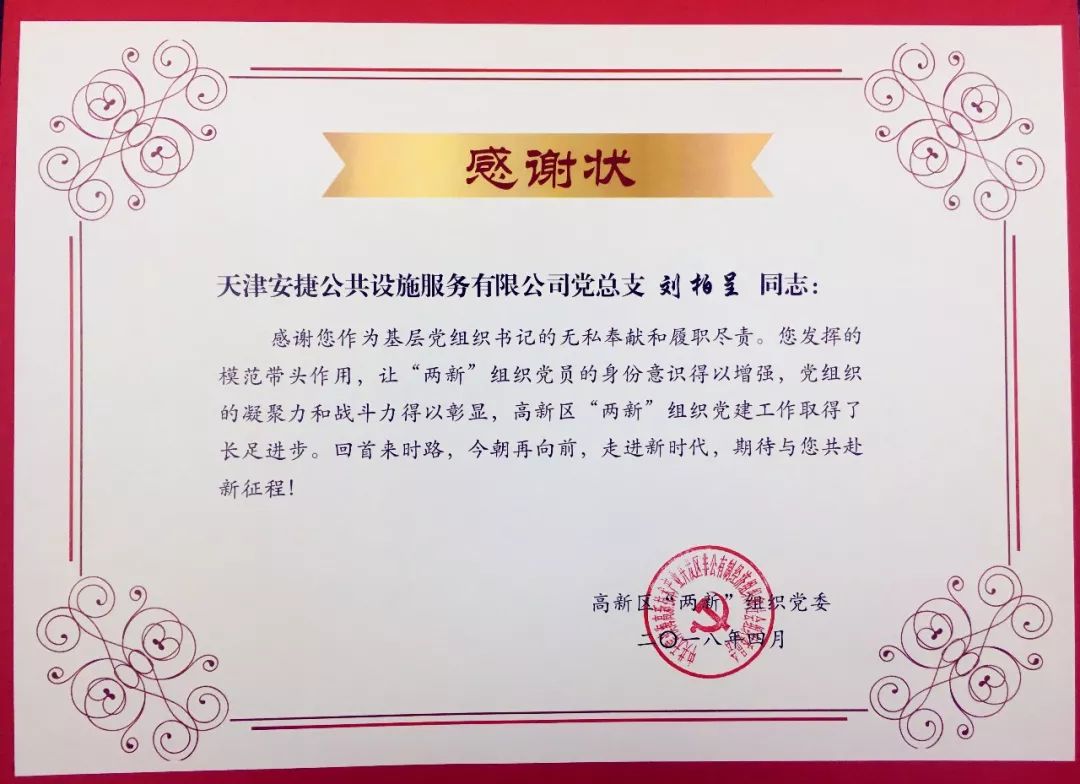 经过高新技术企业党委2017年度工作考核,天津今年会jinnianhui公共设施服务有限公司获得“优秀”的党组织荣誉称号,同时,今年会jinnianhui董事长刘柏呈同志获得“优秀”的党组织负责人荣誉称号。